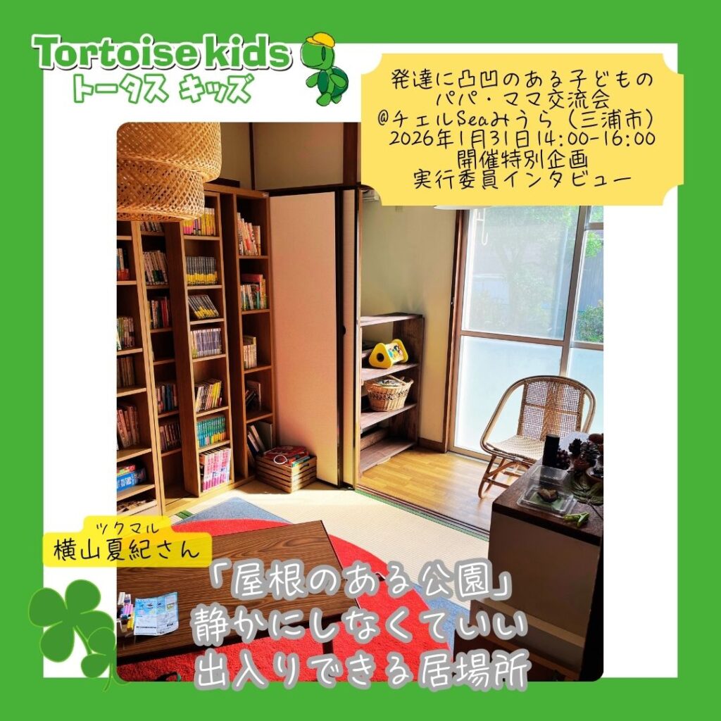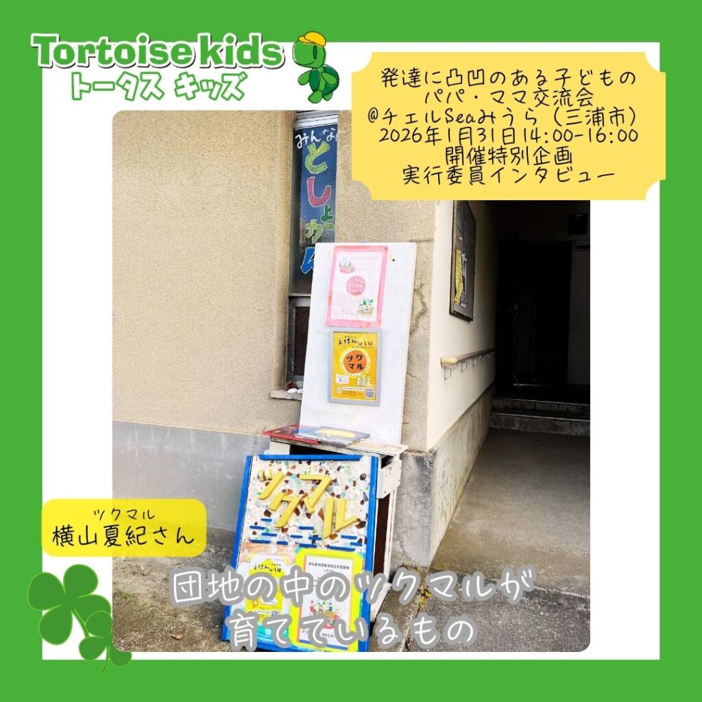 1月31日に開催する「発達に凸凹のある子どものパパママ交流会」は、行政や福祉の“仕組み”だけでなく、地域の中で、人と人がどうつながっているかを大切にした交流会です。今回お話をうかがったのは、団地の中にある“屋根のある公園”のような場所、津久井浜団地徒歩0分図書館(ツクマル)の横山夏紀さん。「支援する・される」ではなく、一緒に暮らすという感覚で地域と関わる横山さんの言葉には、この交流会の空気感そのものが詰まっていました。