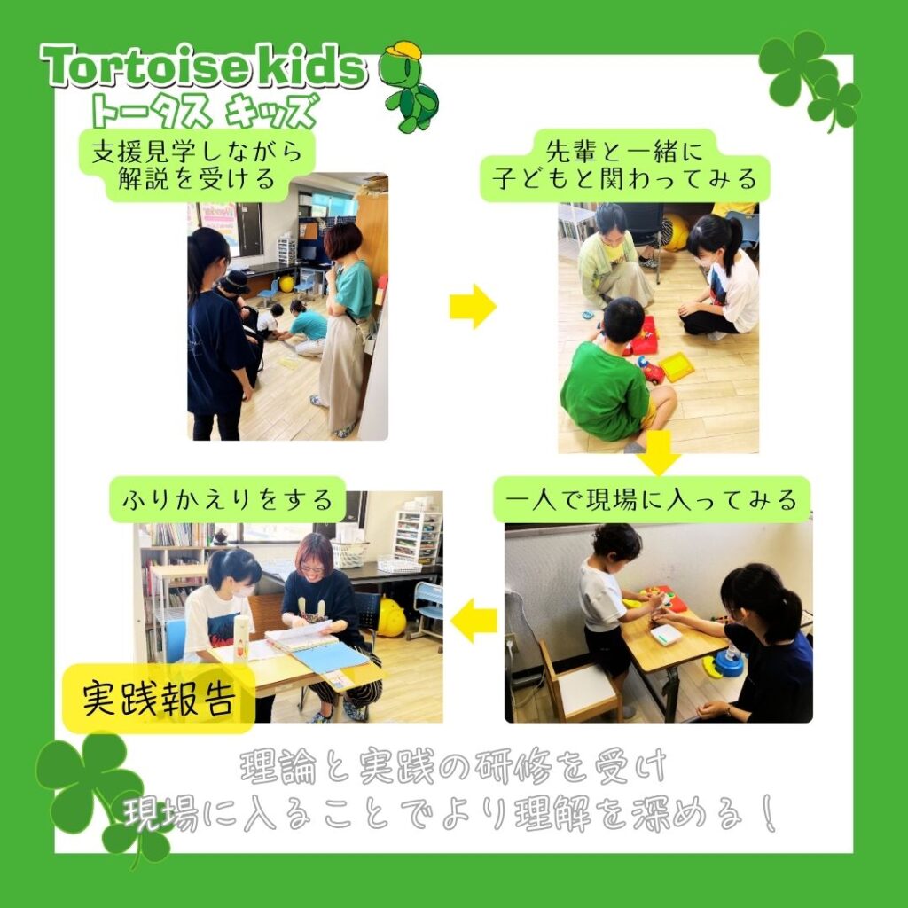 初日は支援者研修。インターン受け入れのため、トータスキッズとして地域の支援者に無料で提供している研修を追加で実施、こども園の先生、相談支援員、支援者と、様々なジャンルの受講生と関わりながら、子どもたちを支えるための理論と実技を学び、いろいろな職場の方とも触れ合いながら、支援の世界の扉を開きました。
